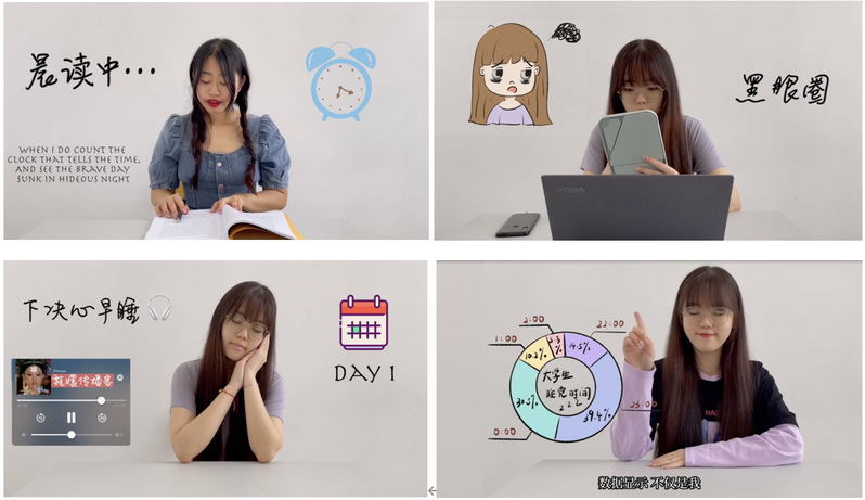创意视频《大学生!又熬夜了吗?》从大学生自身普遍面临的睡眠问题入手,选材于寒假期间线上学习的经历,因疫情原因,创作团队首次尝试了全流程线上交流、制作。