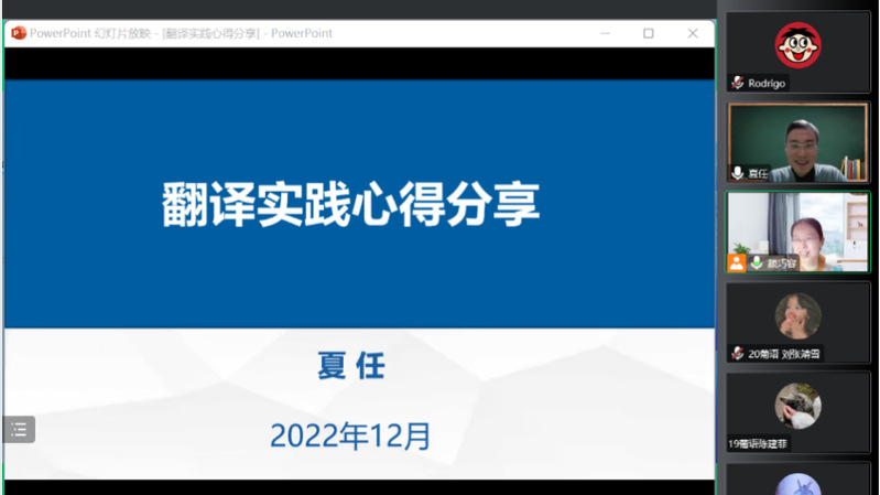 夏任老师从讲好中国故事出发,引入翻译的基本素养,运用丰富的语言翻译例子告诉同学们翻译需要具有责任感、工匠精神以及慎之又慎的态度;夏老师随后列举出翻译中的很多难点问题,指出翻译需要了解中国国情,做好基本知识储备,从表达技巧,到翻译前的准备,再到应急情况处理和口译的礼仪,为同学们介绍翻译,特别是口译的策略与技巧;夏老师在最后结合自己丰富的翻译实践经历,与同学们分享自己的心得与体会,鼓励同学们更加努力。