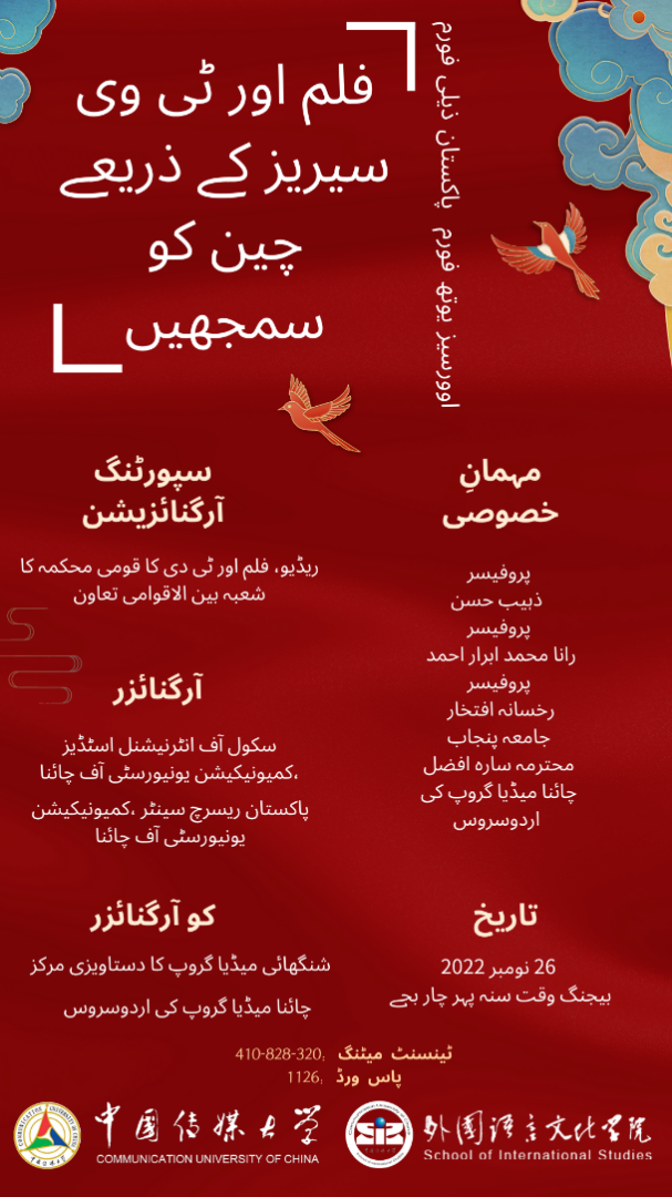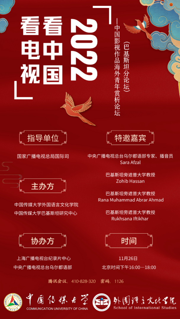 11月26日晚,“看电视 看中国”中国影视作品海外青年赏析论坛(巴基斯坦分论坛)于线上成功举办。此次论坛由国家广播电视总局国际司指导,中国传媒大学开云手机官方版在线入口和中国传媒大学巴基斯坦研究中心联合承办,上海广播电视台纪录片中心和中央广播电视总台乌尔都语部协办。此次论坛以高校为窗口,以海内外青年学生为受众助力中国影视作品海外推广与传播,为青年人搭建真实、全面、客观了解中国和中国文化的平台。