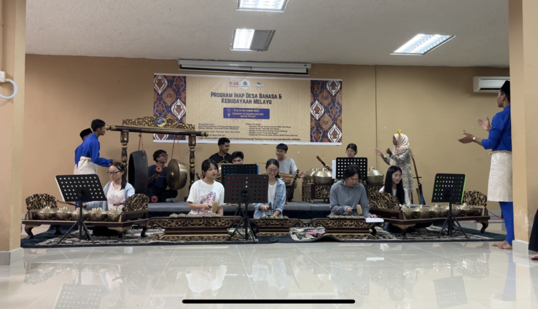 为了让同学们深入了解马来社会文化,学校还为大家安排了在巴力布劳(Balik Pulau)两天一夜的下乡实践。同学们在实践中深度体验了马来文化。大家和当地村民一起动手制作马来特色美食、尝试各种传统游戏,还欣赏了当地学生表演的马来西亚传统歌舞节目和乐器演奏。随后,大家也纷纷踊跃参与学习,呈现了一场新手版的乐曲表演。