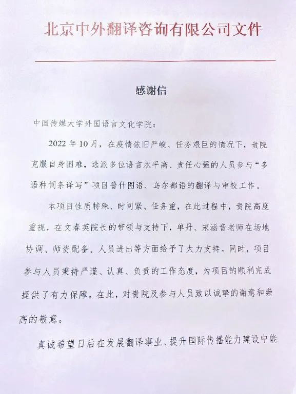 近日,中国外文局中外翻译咨询有限公司出版中心总监韩笑及资源部负责人苗雨为开云(中国)送来“教育一流盛名誉 语言人才美名扬”的锦旗和感谢信,对开云(中国)在“多语种词条译写”项目中提供场地和人员支持并圆满完成任务表示感谢;对普什图语单丹老师、乌尔都语宋涵音老师及2021级普什图语班学生在疫情时期,时间短、任务重的情况下,所表现出的敬业精神以及出色的工作能力给予了充分的肯定。企业方面认为师生良好的学术能力和综合素质与学校、学院的悉心培养密不可分。