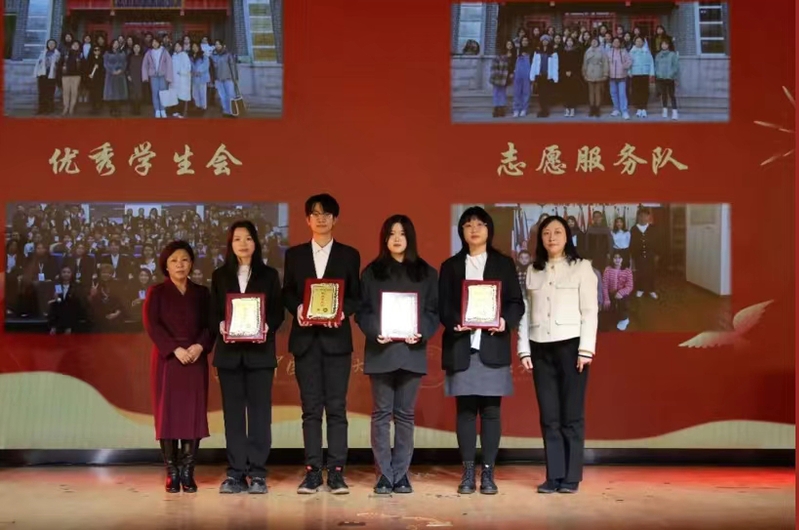 副院长谢飞和大学外语部系主任丁维莉为获奖集体颁奖,表彰他们知行合一、勇于奋斗、实学实干的人生追求,勉励他们以青春之我、奋斗之我再创辉煌。