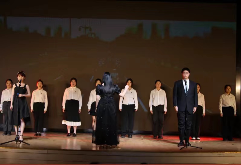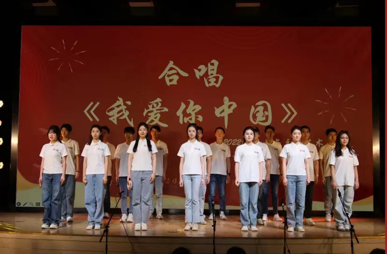 最后,2022级播音主持与艺术(中英双语播音主持方向)的同学们带来合唱《我爱你中国》,在歌曲营造的恢弘壮阔的意境之下,用铿锵有力的歌词与积极昂扬的热情,将对伟大祖国母亲的赞颂之情与真挚热爱推上顶峰。