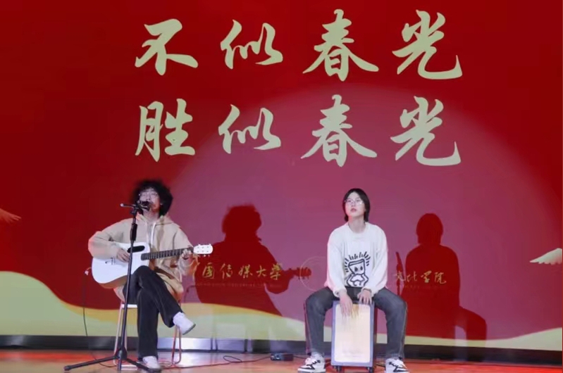 往事越千年,魏武挥鞭,东临碣石有遗篇。萧瑟秋风今又是,换了人间。在毛泽东主席的诗词感召下,吾辈仍需勇往直前。2021级网络与新媒体(智能融媒体运营方向)梁凯奕、2022级翻译专业王一伊带来原创歌曲《秋风换人间》抒发出对于祖国最为真挚的肺腑之情。