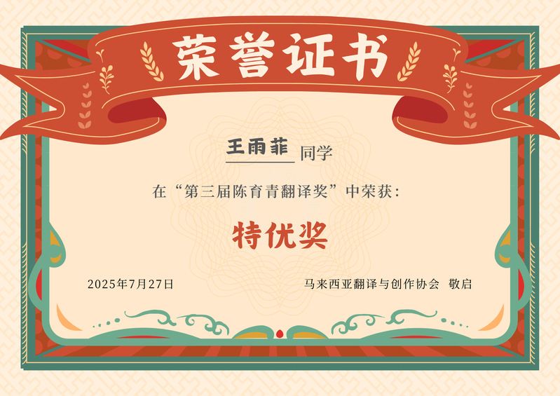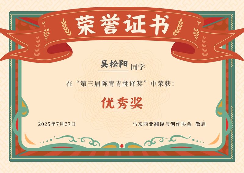 本届翻译比赛吸引了来自中国和马来西亚的翻译爱好者和高校师生,共计收到48篇参赛作品,分为马来西亚组和国际组两个组别。评委会根据翻译准确度(50%)及语言风格(50%),从两个组别分别选出6名获奖者,其中一名特优奖、两名优秀奖及三名佳作奖。开云(中国)2024级国别和区域研究(东南亚文化方向)硕士研究生王雨菲的译作《远方的巨塔》获特优奖,2021级马来语专业学生吴松阳的译作《寻常一日》获优秀奖。