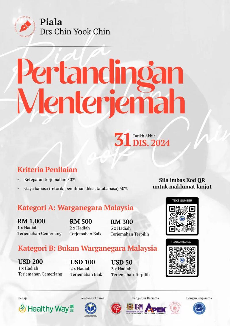 2025年7月27日,“2025年华马翻译培训班结业仪式暨第三陈育青翻译奖颁奖礼”在马来西亚国家语文局举行。马来西亚国家语文局董事会主席、第十届国家文学奖得主拿督安瓦尔·里德万,马来西亚翻译与创作协会会长林尊文、副会长吴尚雄,马来西亚国家语文局推广与认证部主任罗吉娅·默罕默德等出席颁奖仪式。“第三届陈育青翻译奖”马华短篇小说翻译比赛由马来西亚翻译与创作协会主办,马来西亚汉文化中心及马来西亚理科大学人文院翻译研究中心联办,马来西亚南方大学学院中马区校友会及中国外文局CATTI项目管理中心为支持单位。
