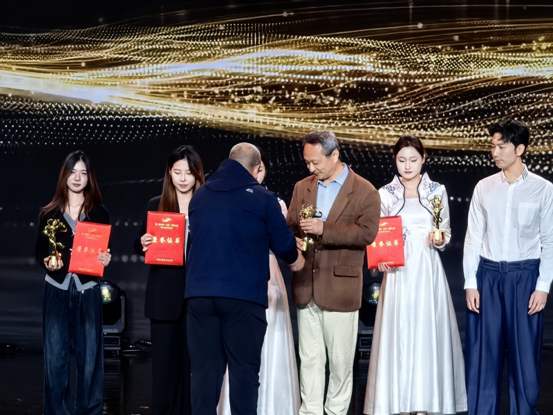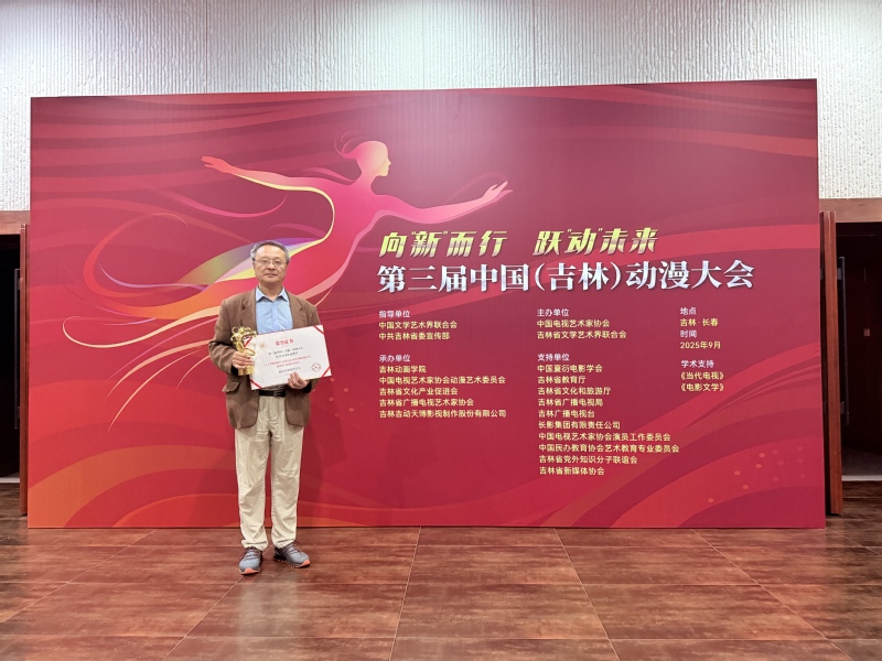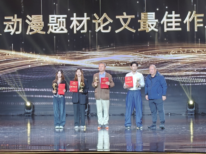 著名影视演员钱洁、张可盈最先揭晓了动漫题材论文最佳作品奖,赵硕老师的作品《人工智能浪潮下动漫作品对外传播的新范式、新伦理与新路径探索》获得第三届中国动漫影视节动漫题材论文最佳作品奖。中国电视艺术家协会副主席、著名导演刘江上台为赵硕老师颁发了奖杯和获奖证书。